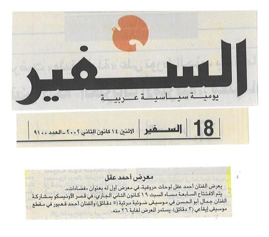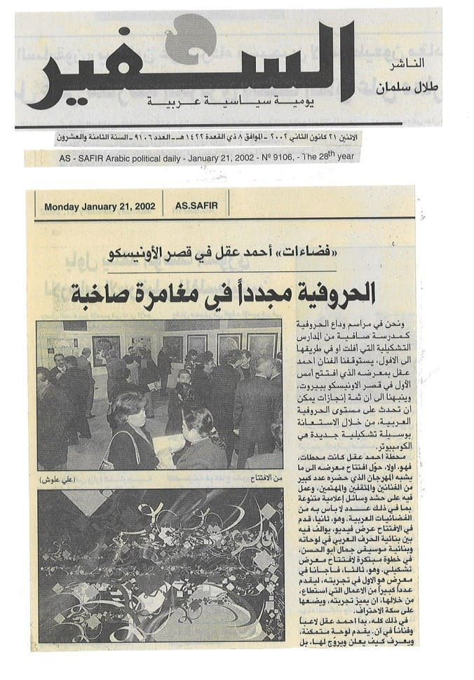 As we bid farewell to calligraphy as a pure school within the world of visual arts—one that has either faded or is on its way to fading—artist Ahmad Akl pauses us with his exhibition, which opened the day before yesterday at the UNESCO Palace in Beirut. He reminds us that there are still possible achievements in the realm of Arabic calligraphy, especially with the help of a new artistic tool: the computer.